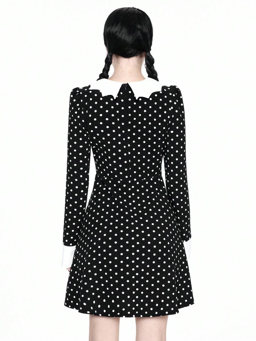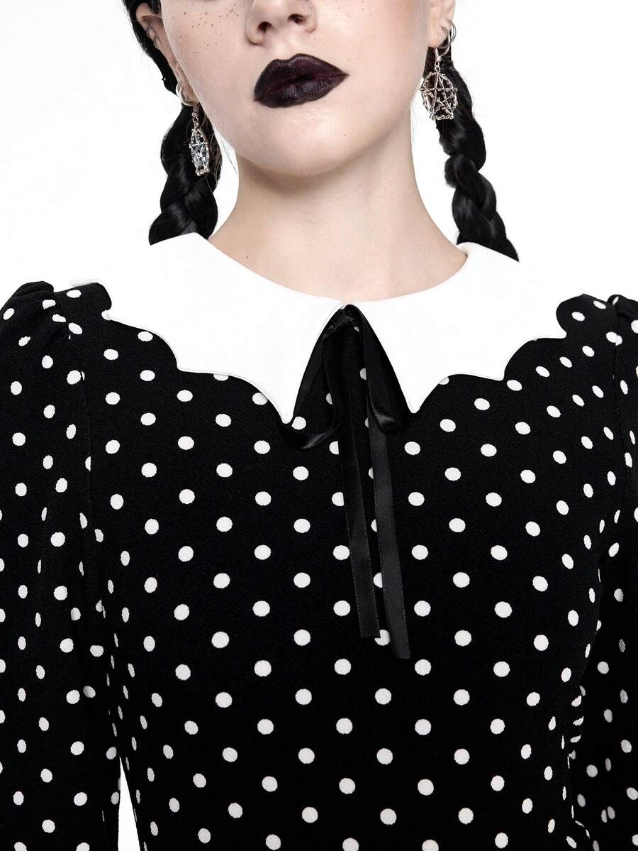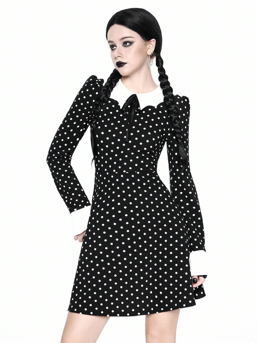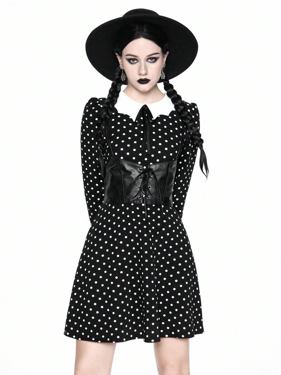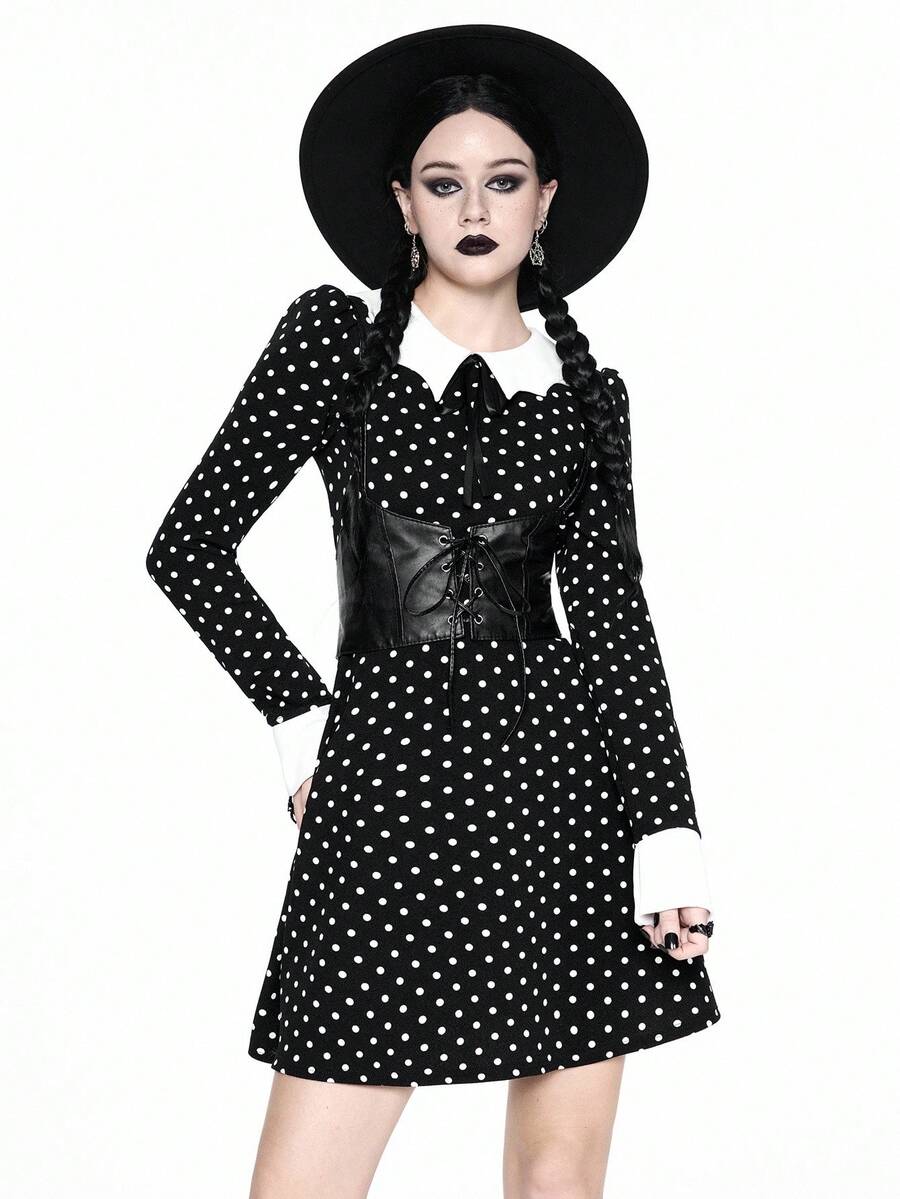 Damen Gothic Kleid mit Polka Dot Muster und Fledermaus Kragen, Halloween