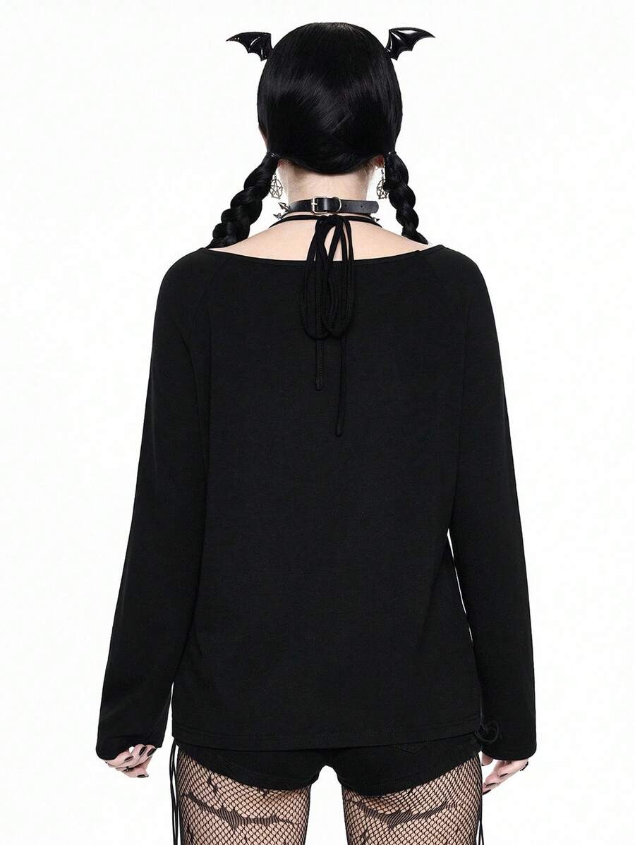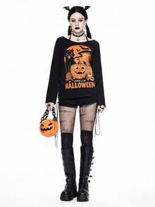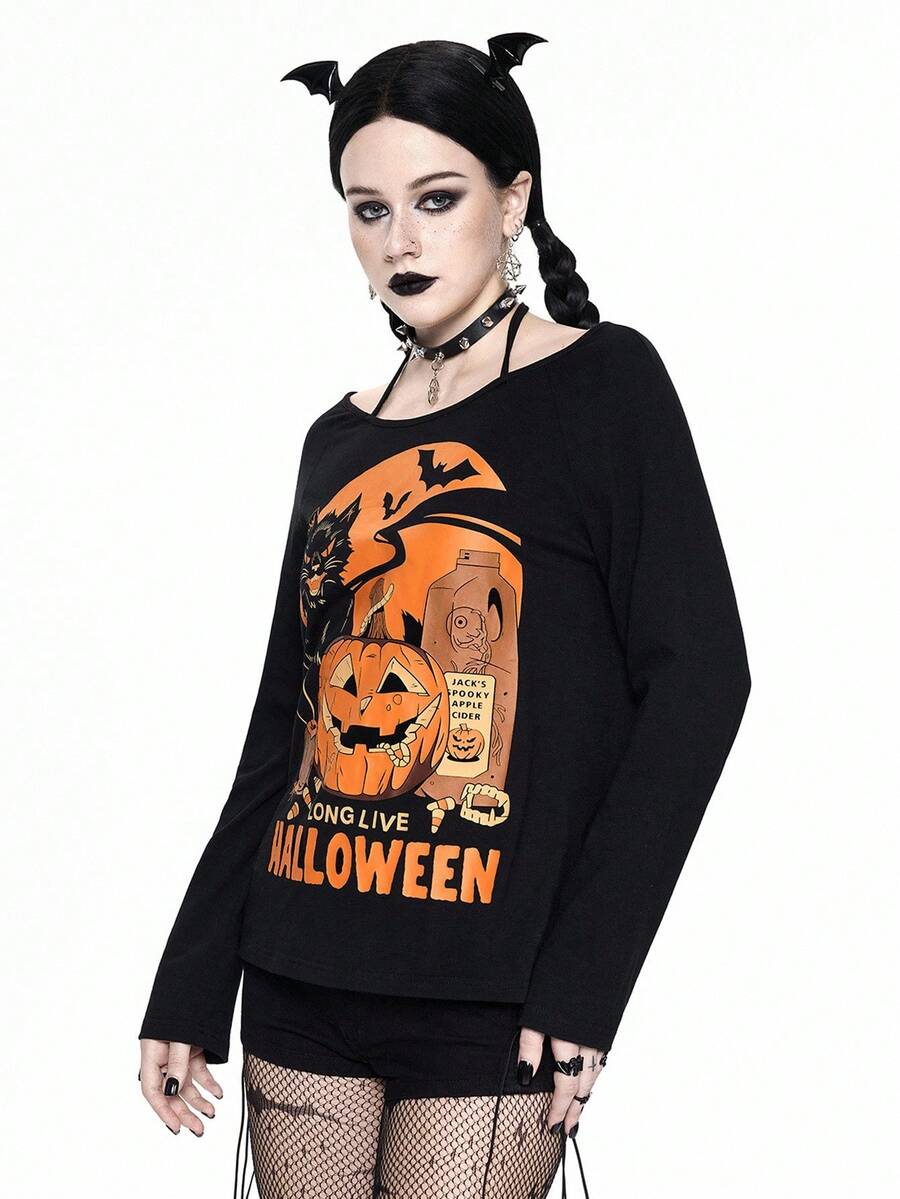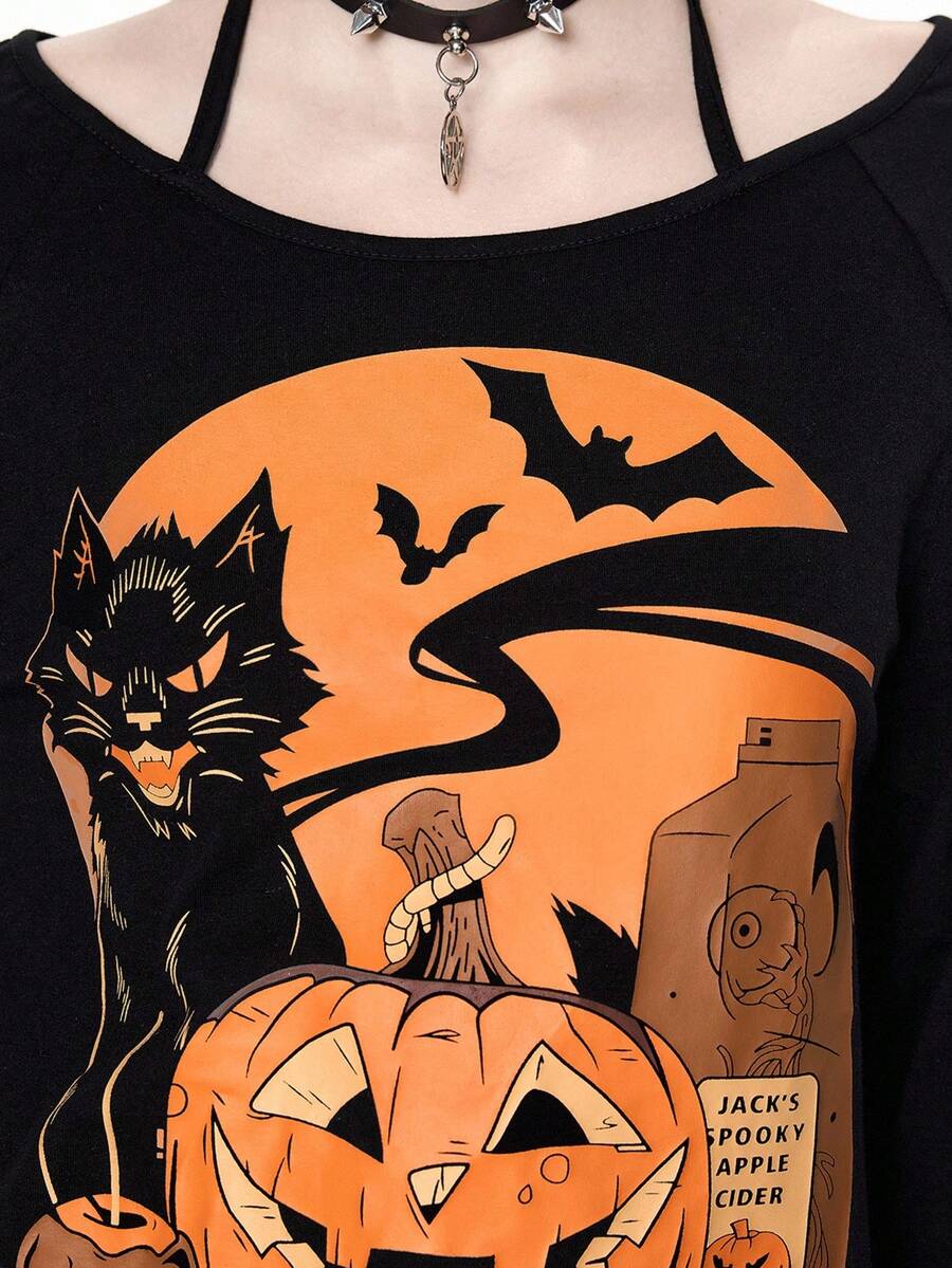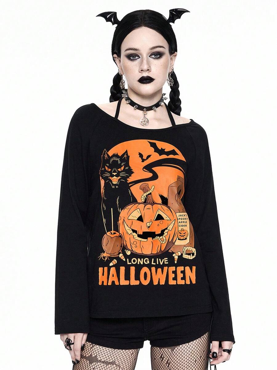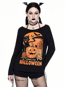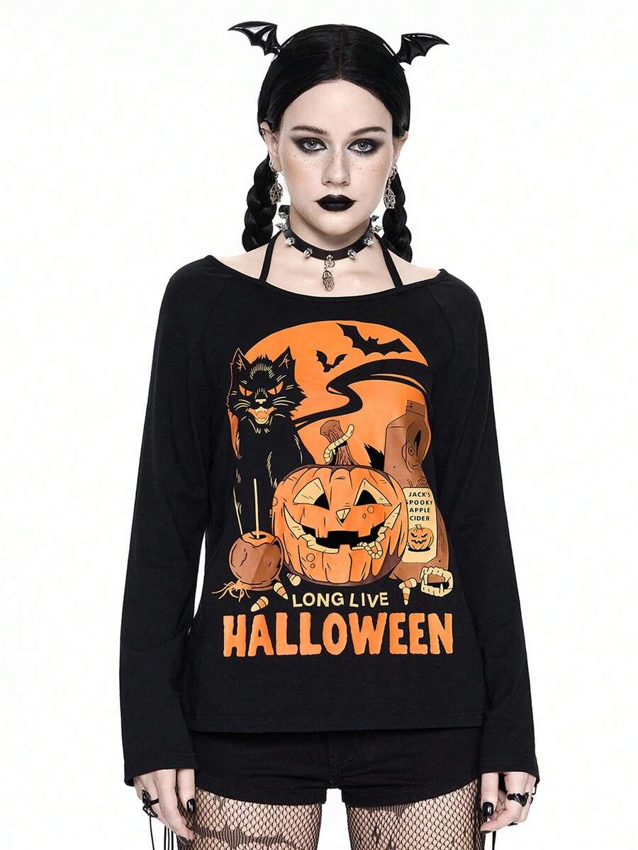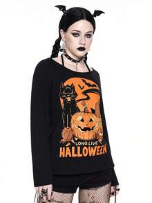 Damen Halloween Kürbis & Katzen Muster Trägertop Langarm T-Shirt