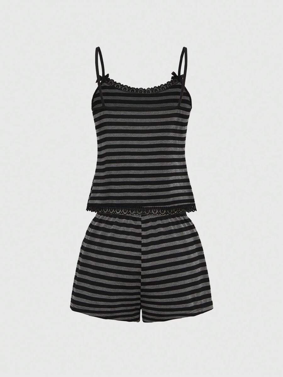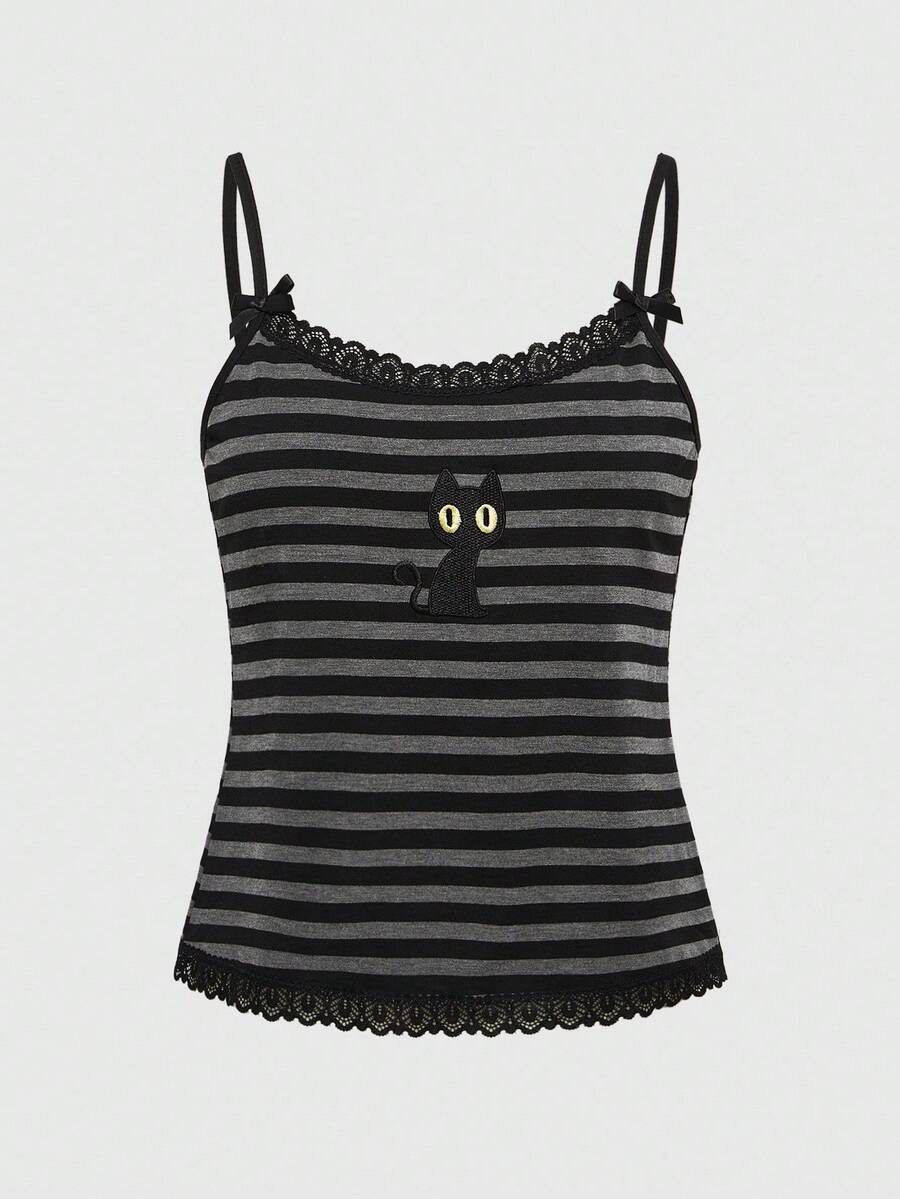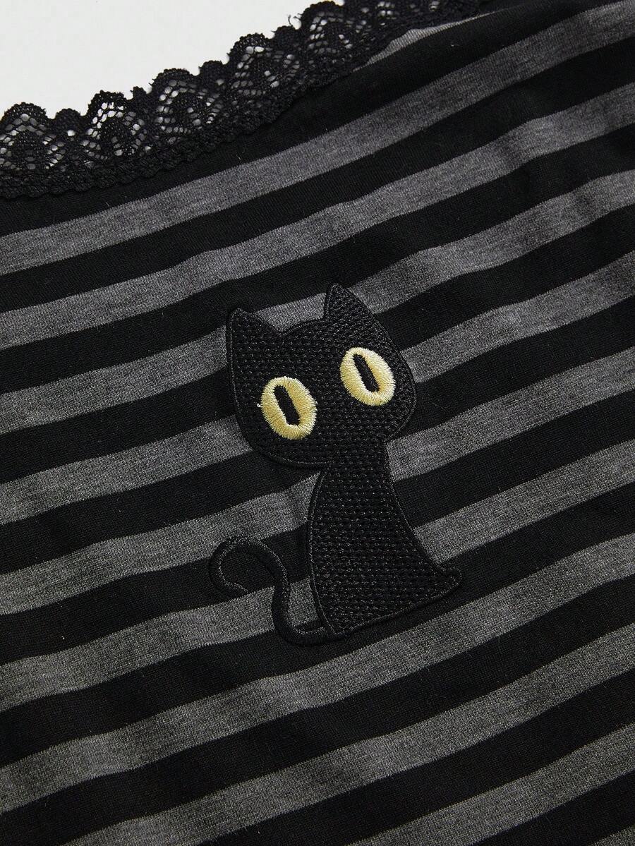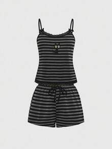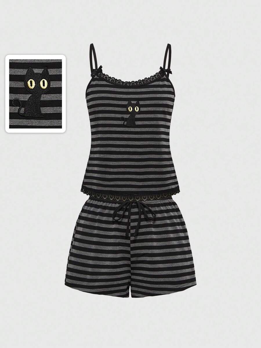 Damen Hippie gestreifter Spitzen-Camisole mit Schleife & bestickter schwarzer Katzen-Shorts Pyjama Set