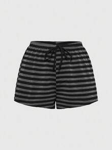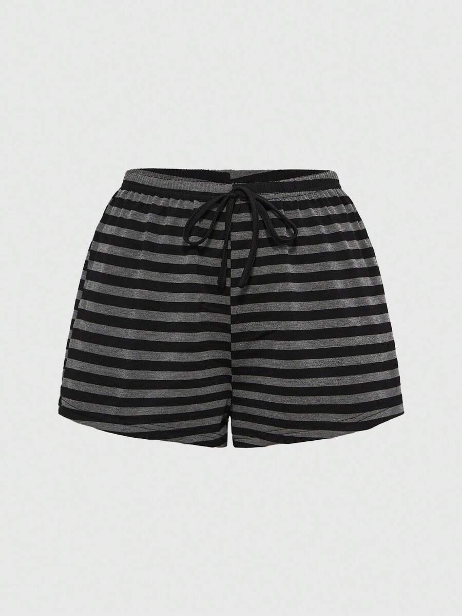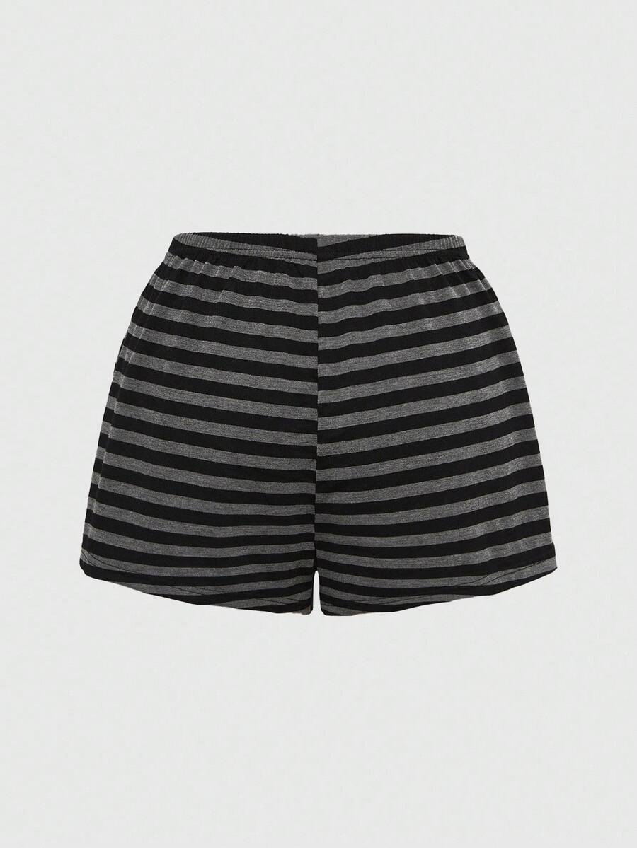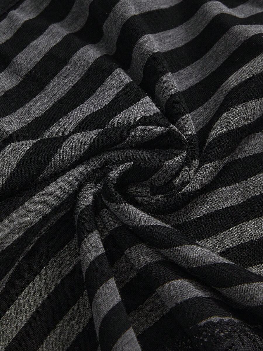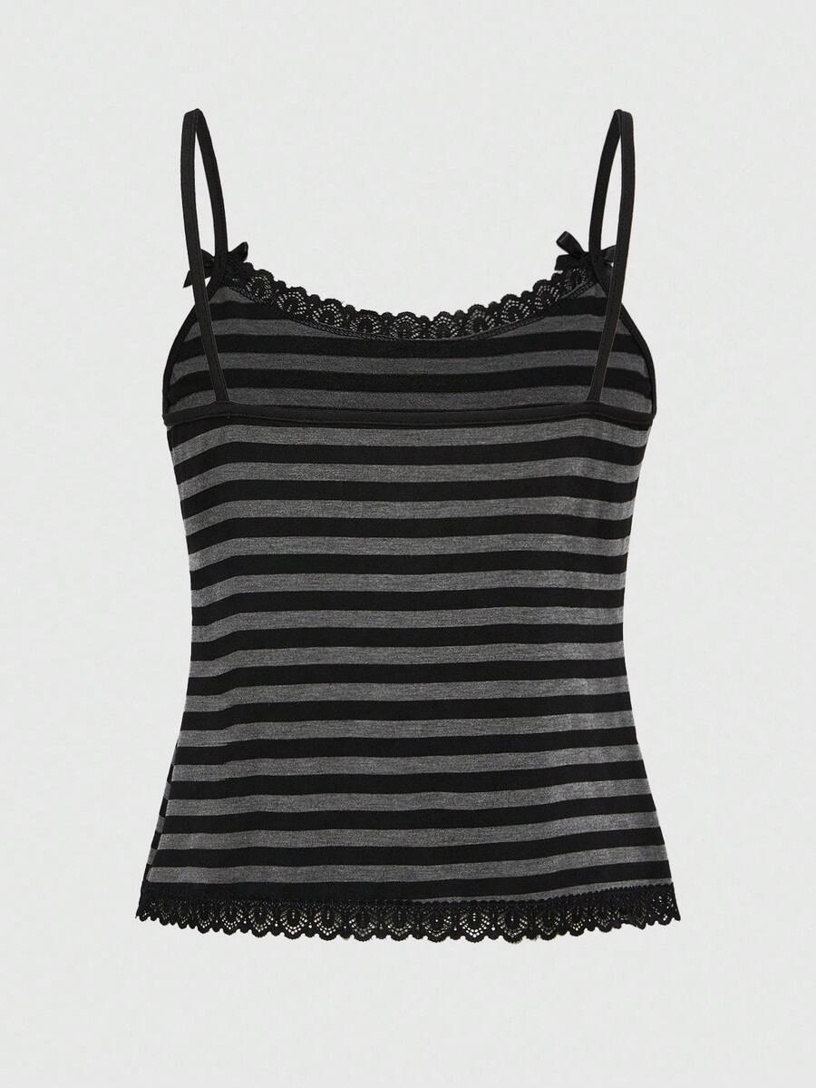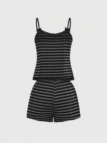 Damen Hippie gestreifter Spitzen-Camisole mit Schleife & bestickter schwarzer Katzen-Shorts Pyjama Set