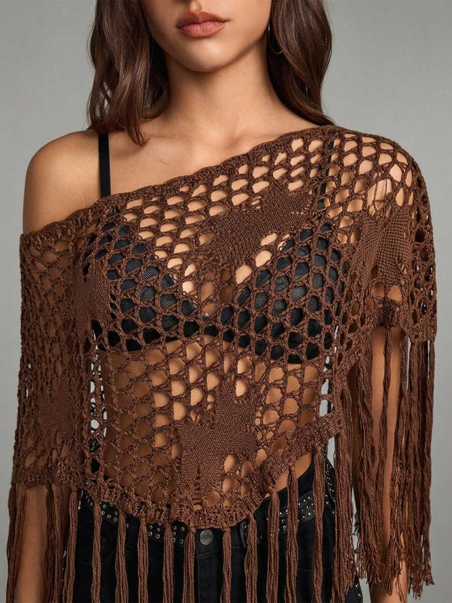 Damen Retro Musik Festival Hippie gehäkelter Perlen Quasten Saum Cover-Up