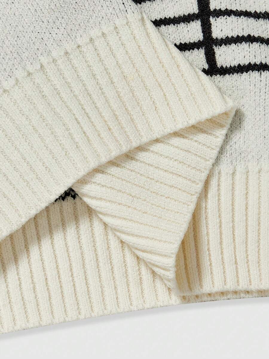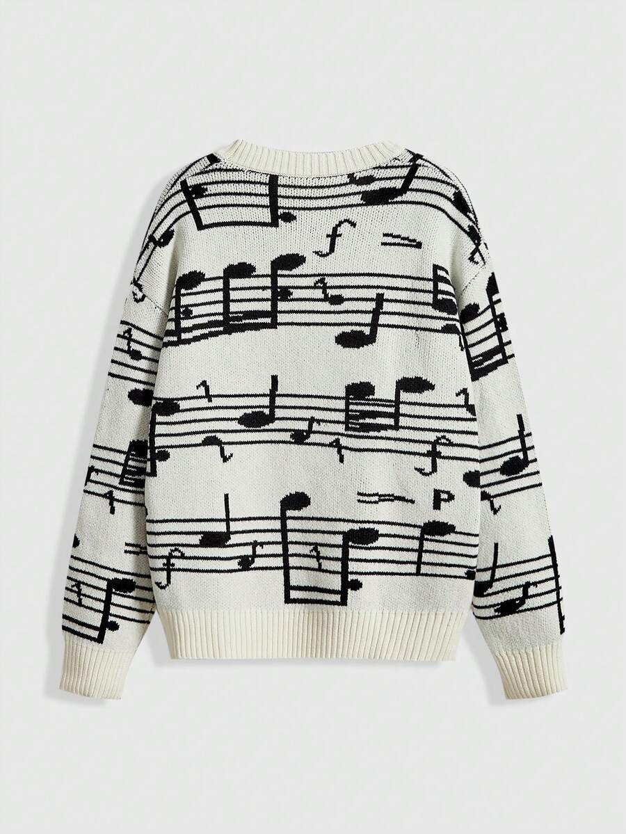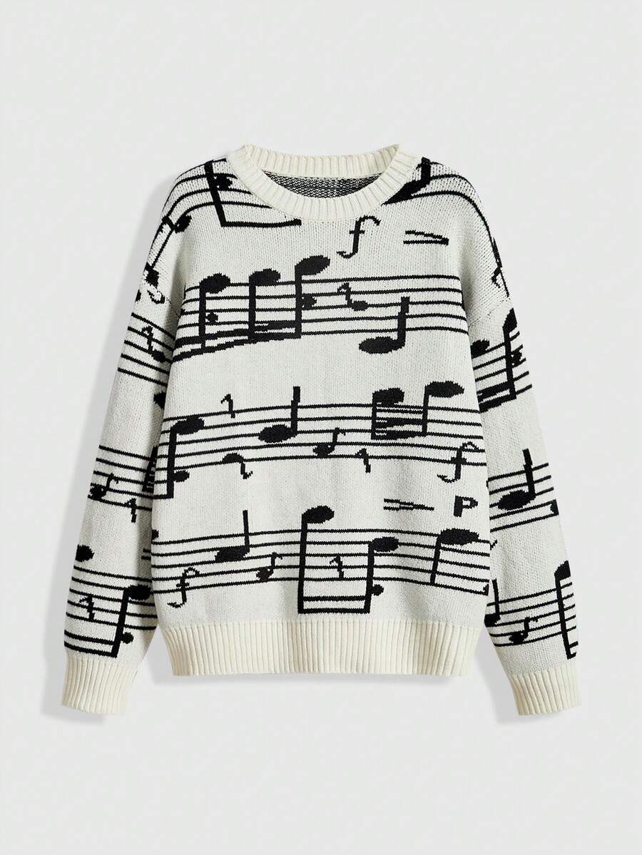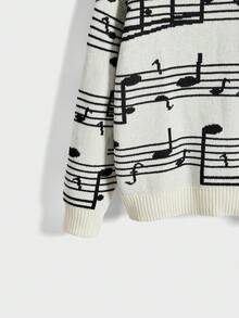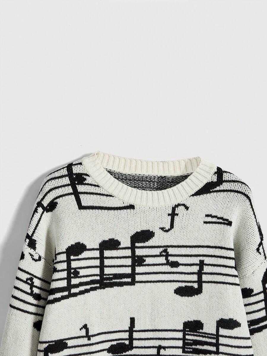 Damen Retro Pullover mit Musiknoten- und Violin-Schlüssel-Jacquard-Strick