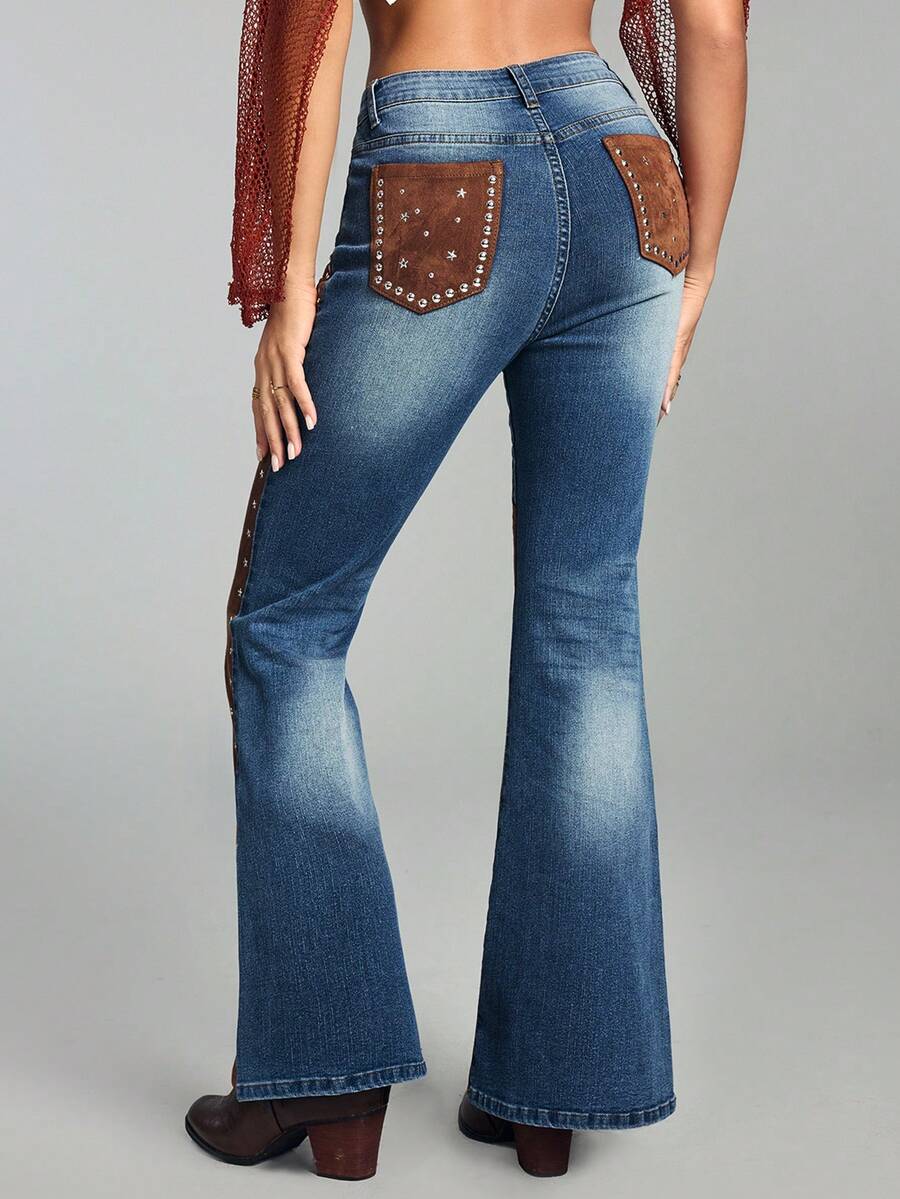 Damen Retro Western Cowgirl Hippie 2 in 1 Wildleder Patchwork Nieten Schlagjeans