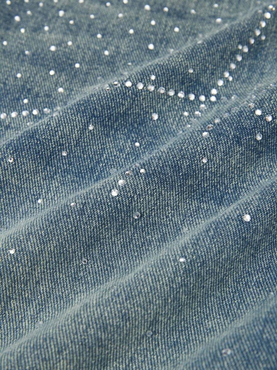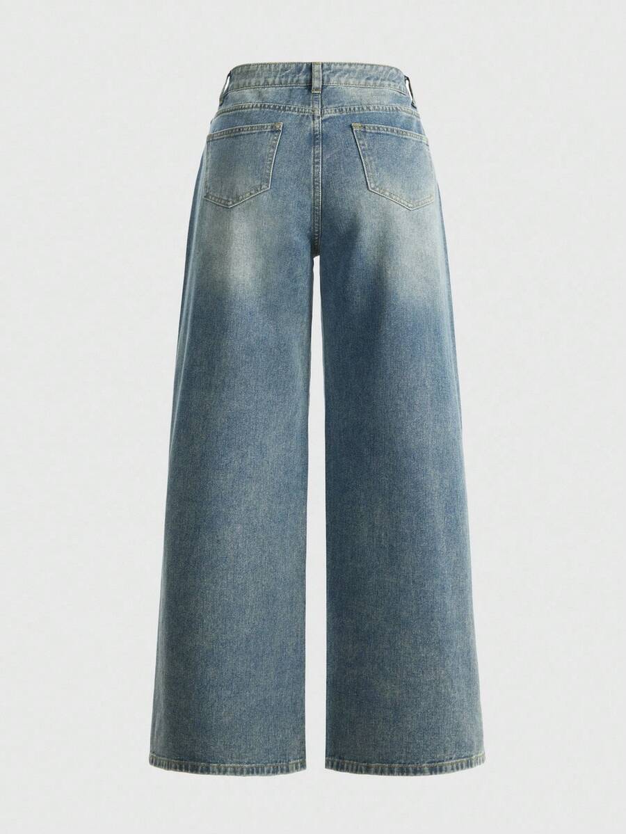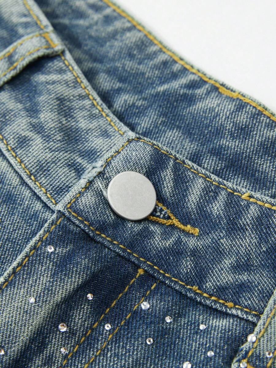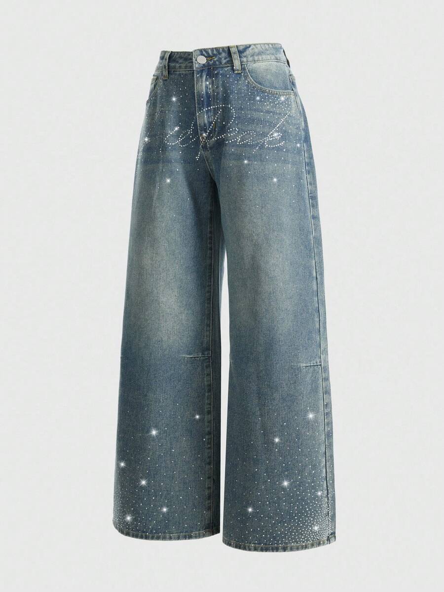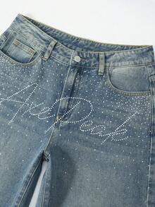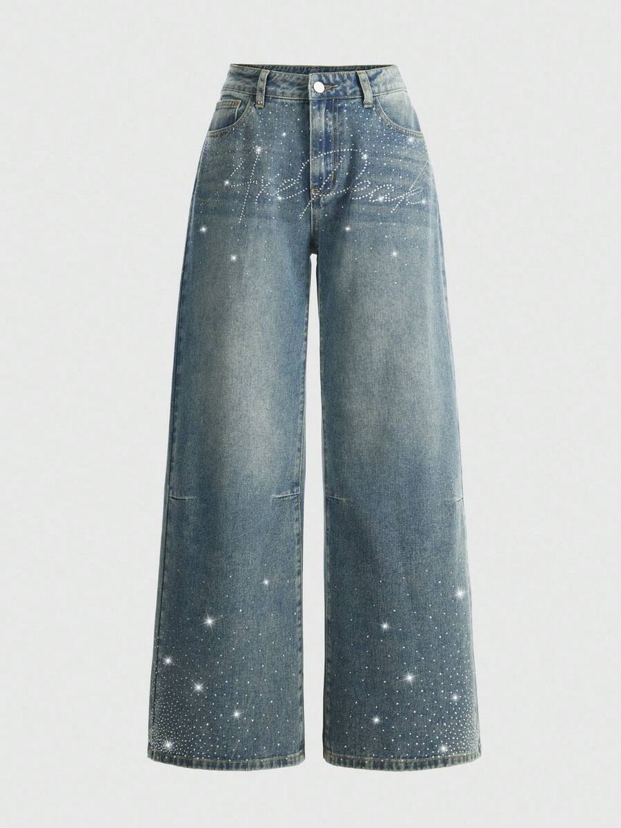 Damen Jeans im weiten Bein Punk-Stil mit Strass-Verzierung und englischem Text, locker geschnitten