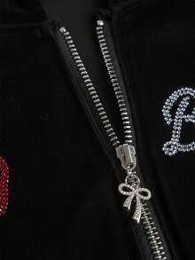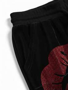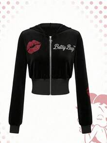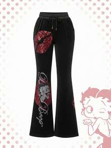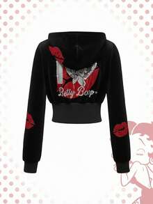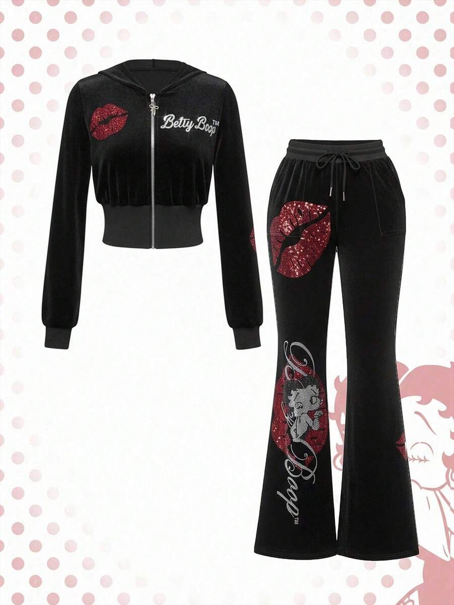 Betty Boop | ROMWE Damen Y2K Samt Cartoon Charakter Rot Lippen Strass Reißverschluss Kapuzenjacke und weite Hose 2 Stücke Set
