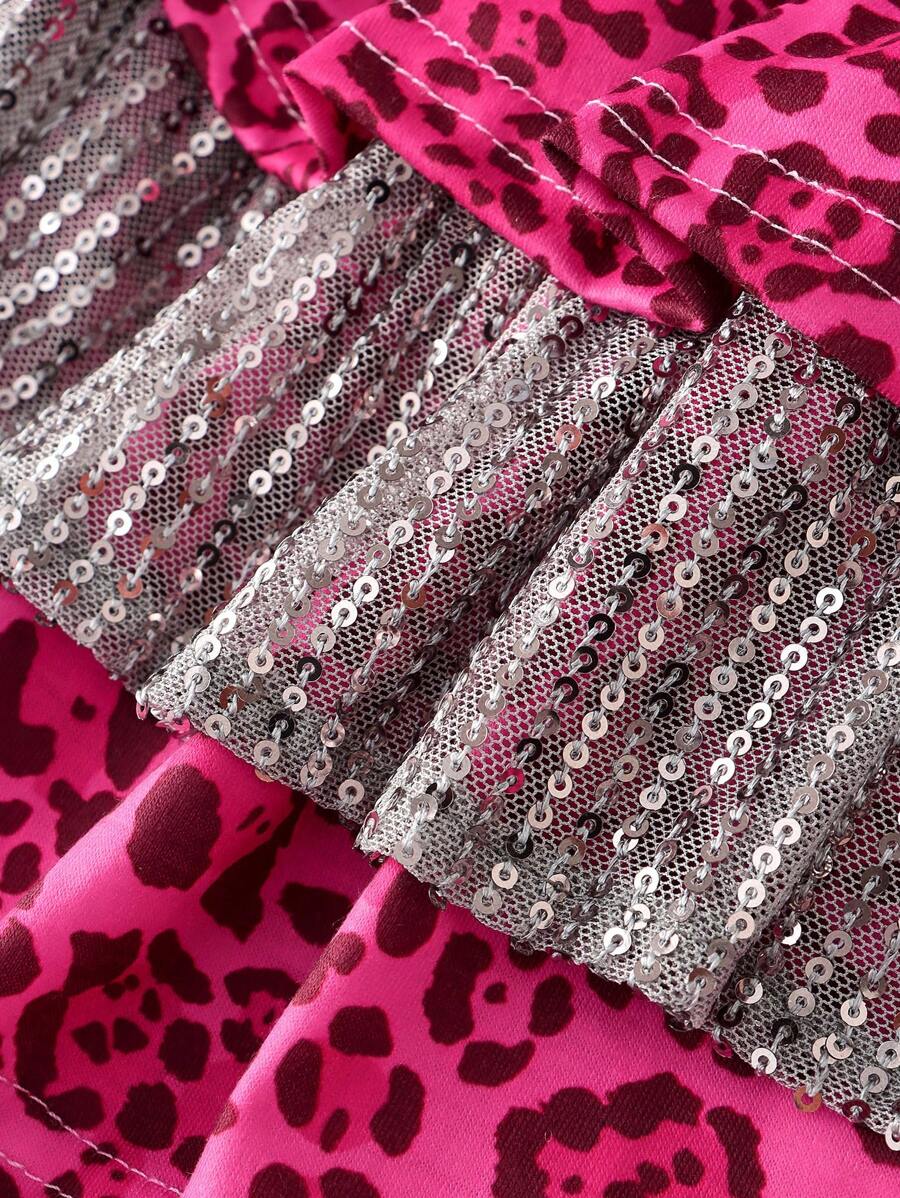 Damen Y3K Millennium Baddie Retro Leoparden Muster Pailletten Patchwork Rüschen Saum Schleife Dekor Mini Rock
