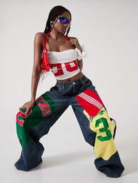 J-Fashion Damen Retro Y2K Street-Style Y2K Babe Logo Dekor Mehrschichtige Taillenbund Kontrastfarben Patchwork Cargo Schlagjeans