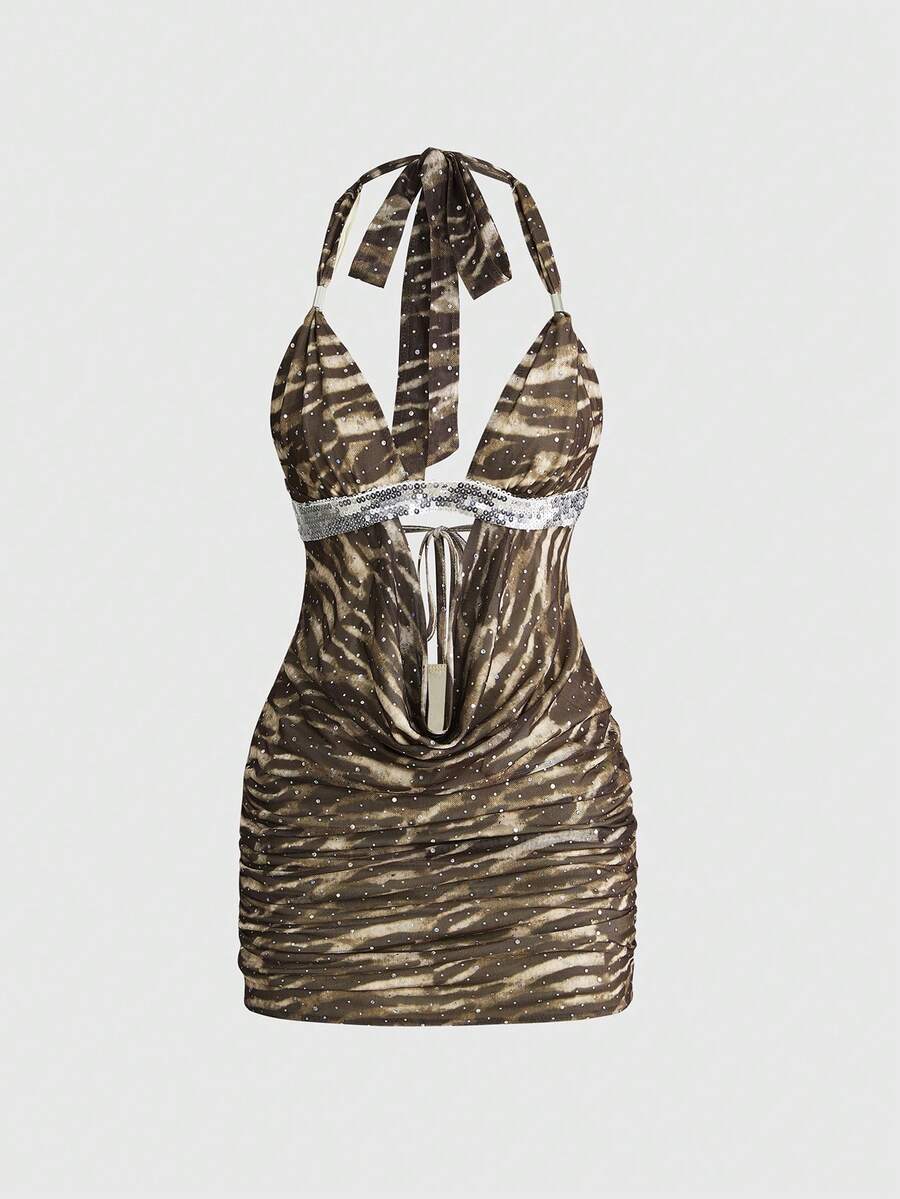 Y2K sexy Diva Musik Festival Tierdruck Neckholder tief ausgeschnittenes Mini-Kleid für Frauen