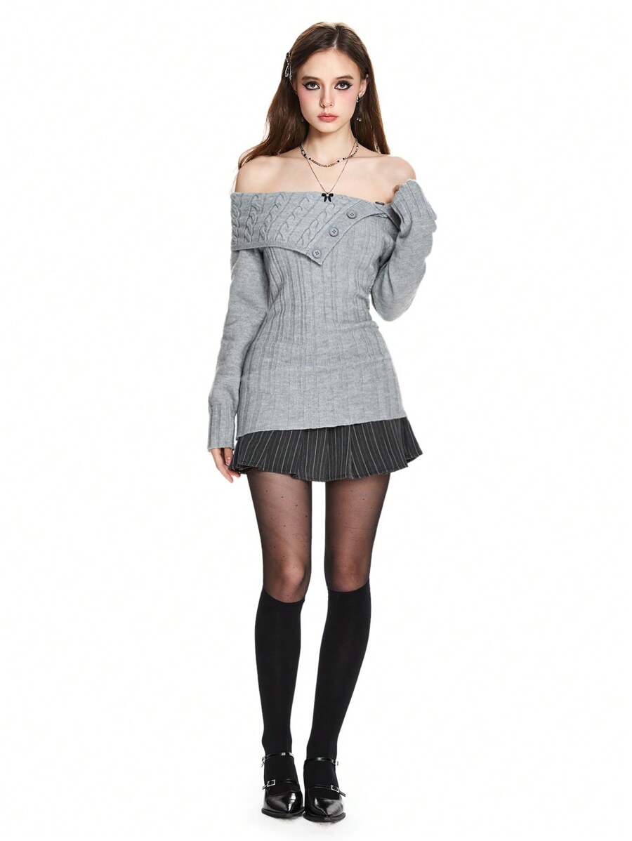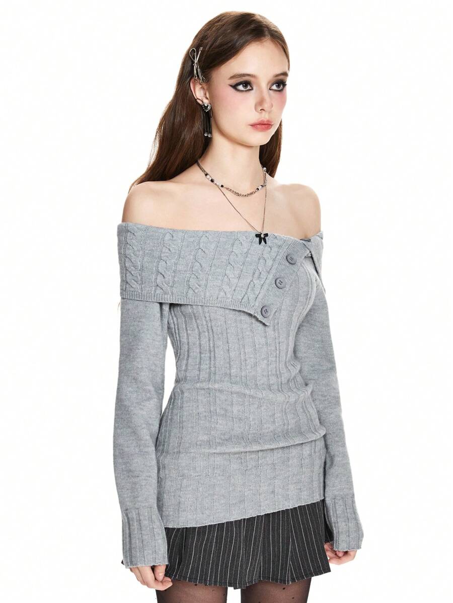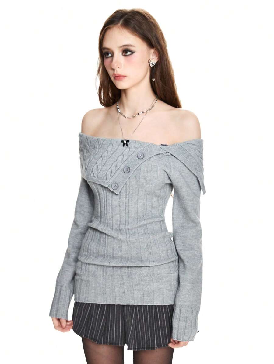 Y2K-Stil Damen Crop Pullover mit Rippenstrick und Carmen-Ausschnitt, Langarm Oberteile