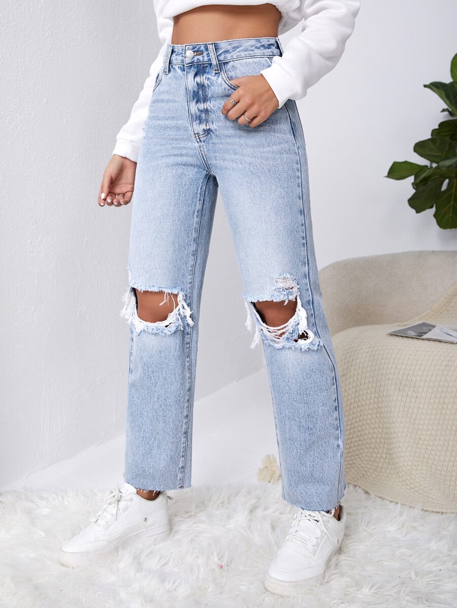 Y2k Zerrissene, Gerade Jeans Mit Rohen Schnitten