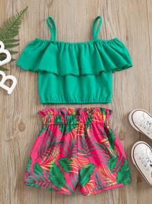 Schulterfreies Rüschenoberteil für junge Mädchen mit Paperbag-Shorts mit tropischem Muster