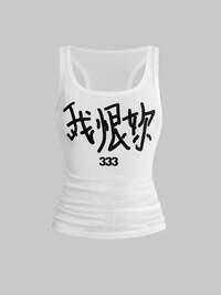 Grunge Punk Chinesischer Kalligraphie-Slogan Emo Musik Festival Vintage Sexy Transparentes Mesh Damen Trägershirt