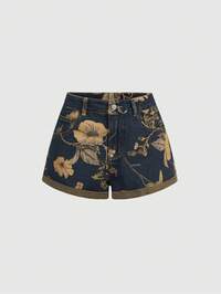 Sommer Neu Mittelblau Washed Denim Y2K Streetwear Vintage Blume Muster Seitentaschen Mode Lässig Weich & Bequem Damen Denim Shorts