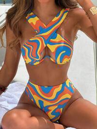 Bunter Bügel BH mit überkreuztem Wellenmuster und Unterteil mit hoher Taille 2 teiliger Badeanzug