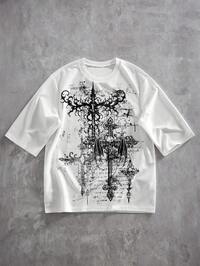Grunge Punk Herren T-Shirt mit Flügel- und Kreuz-Aufdruck für Halloween, Schule, 2000er Jahre Stil mit Dropped Shoulder