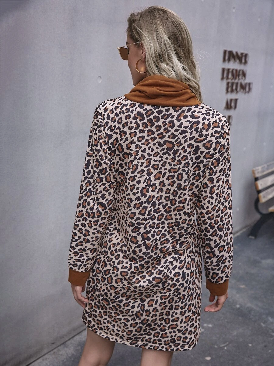 Sweatshirt-Kleid mit Leopard Muster, Schnürung und Trichterhals