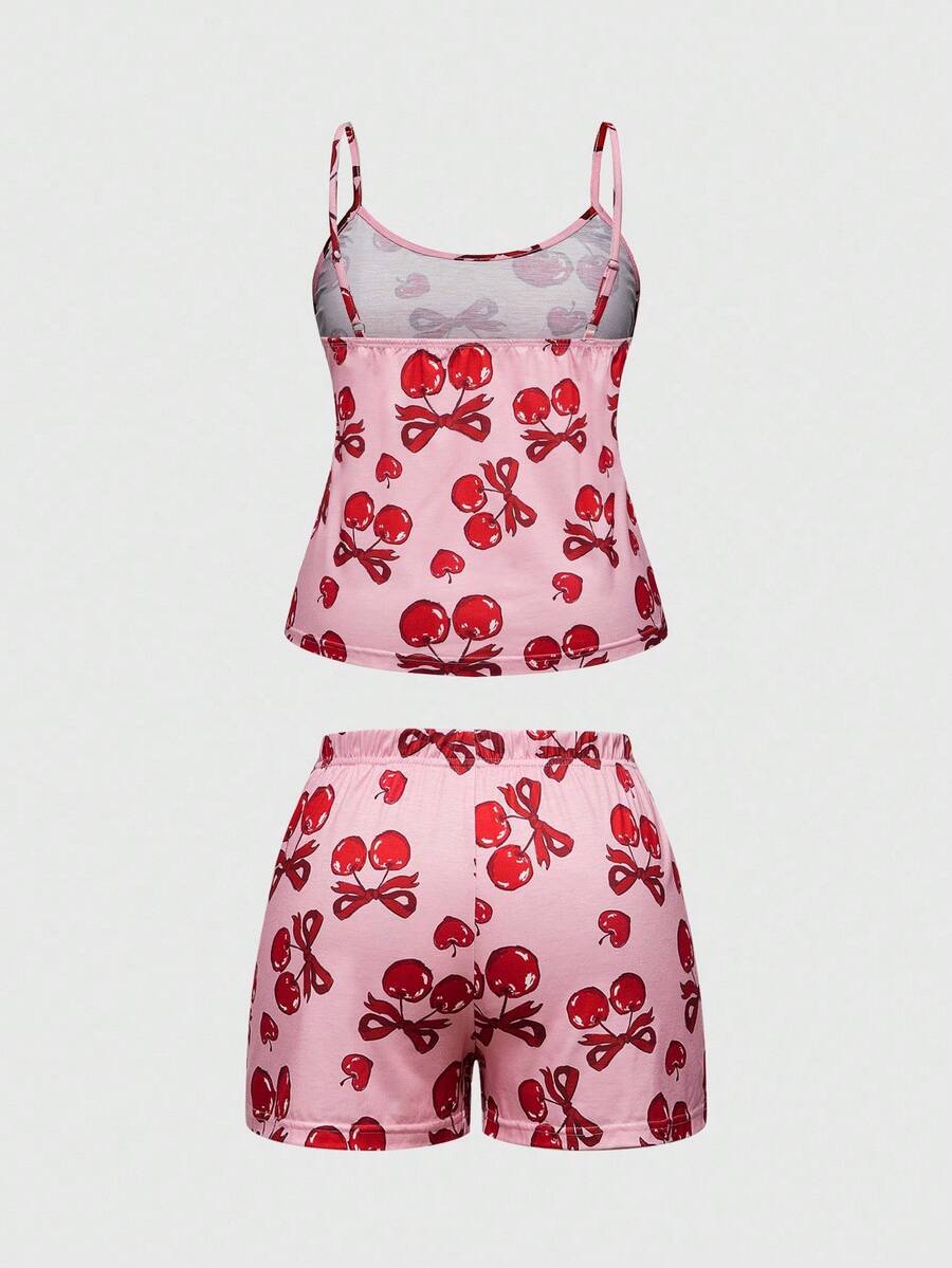 Kawaii Große Größen Kirschenschleife Dekor Camisole & Shorts Pyjama Set, Lässig Loungewear