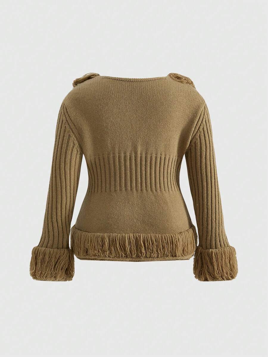 Fairycore Vintage-Strickjacke mit langen Ärmeln und floralem Rüschenbesatz in Übergröße, Herbst/Winter