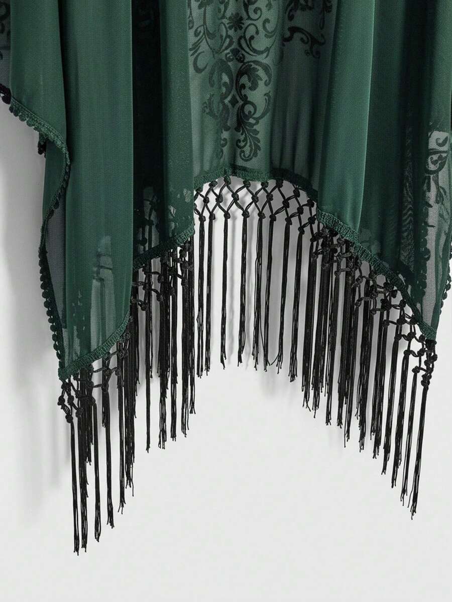 EDITION Romantisch gotischer vintage barocker Ranken-Mond-Muster beflockter Stoff Frühling/Sommer Boho-Textur asymmetrischer Fransensaum Damen Cardigan Top Schal